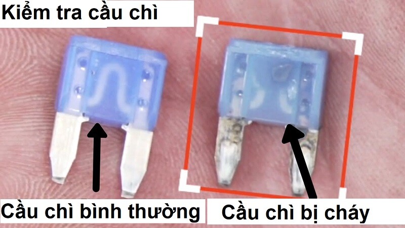 - Kiểm tra bằng mắt thường: nếu dây kim loại bên trong cầu chì bị đứt hoặc cháy đen thì cầu chì đã hỏng.