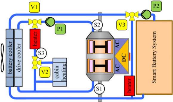 1.5 Van điều khiển nhiệt (Thermal Valve): Các van điện từ (solenoid valves) hoặc van ba chiều (3-way valves) điều chỉnh hướng dòng chảy, ví dụ chuyển từ làm mát sang sưởi ấm. Chúng tích hợp với bơm nhiệt (heat pump) để tái sử dụng nhiệt thải từ motor hoặc inverter.