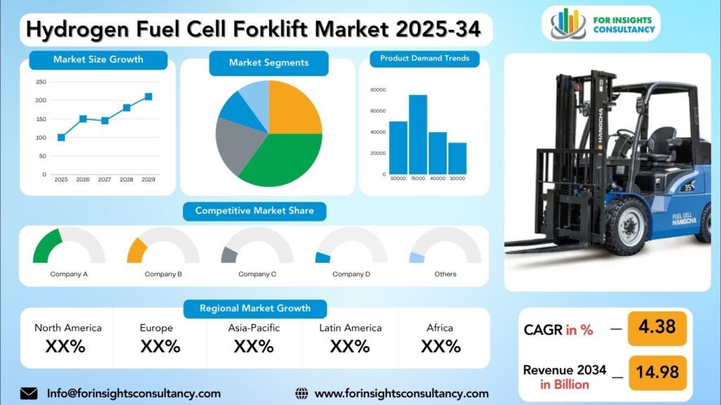 Hơn 50.000 xe nâng FCEV đã triển khai tại kho bãi, tăng năng suất và giảm chi phí bảo dưỡng. Thị trường hydrogen fuel cell forklift đạt 0.92 tỷ USD năm 2025, tăng lên 1.25 tỷ USD năm 2026, dự kiến 422.11 triệu USD năm 2025 với CAGR 7.03% đến 2033.